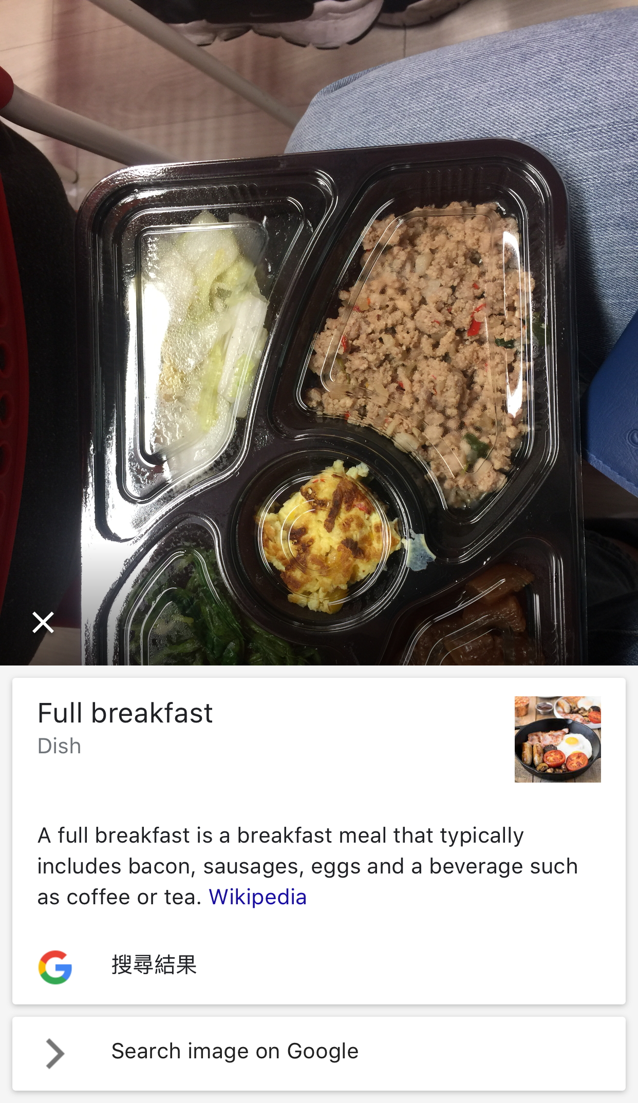 使用過程中我們也發現有一些圖片目前還沒辦法精準判斷,例如下圖的便當被辨認成全套早餐,目前資料庫 Ai判斷基準及資料庫建立還比較偏外國使用習慣,但是機器學習需要過程,隨著大家使用量增加,這個搜尋方式也會越趨精準,期待未來它被大家廣為使用也增進生活方便度。