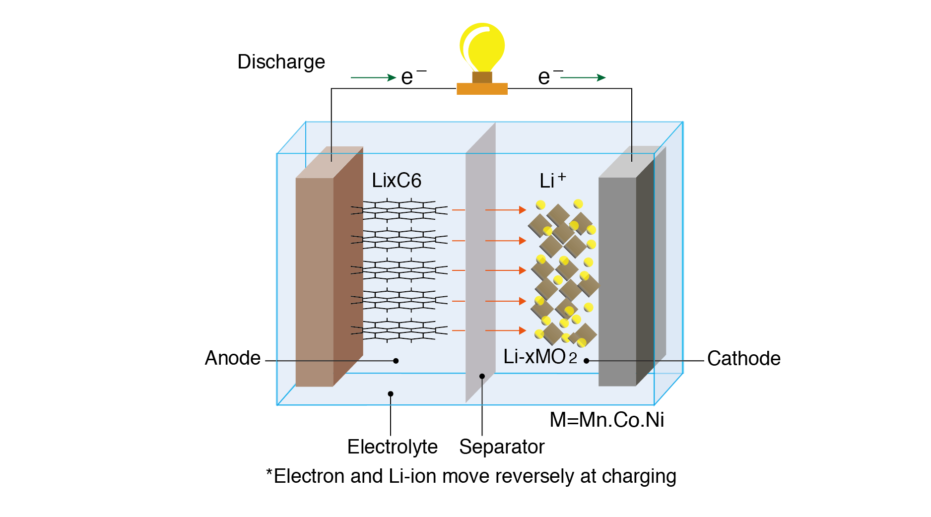 鋰離子電池的充放電仰賴電池正負極的化學反應,(如下圖)電池正極通常是鋰離子化合物負極通常是石墨,充電時藉由正極化學反應讓鋰離子化合跑到石墨(負極)儲存電子,放電時釋出電子(提供能量)讓鋰離子回到正極。在反覆充放電的過程中會讓無法發生化學反應的成分增加,同時降低了電池儲存容量讓電池老化需要更換。而電池容量通常以百分比方式表示 例: iPhone 6s 電池出廠時容量 1715mAh,當容量百分比降低到 80% 這時電池容量剩下 1715mAh x 80% = 1372 mAh。
