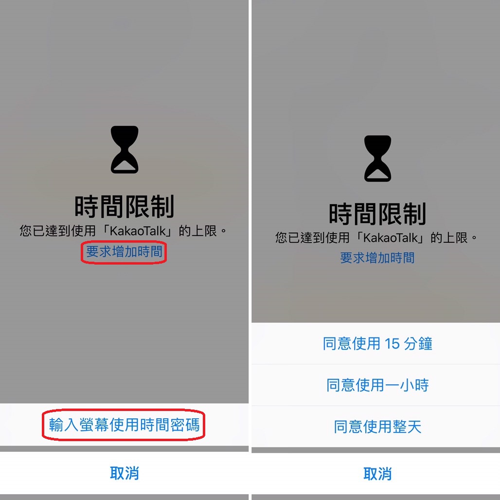 4. 解鎖:要求增加時間>輸入螢幕使用時間密碼>同意使用 XX 時間